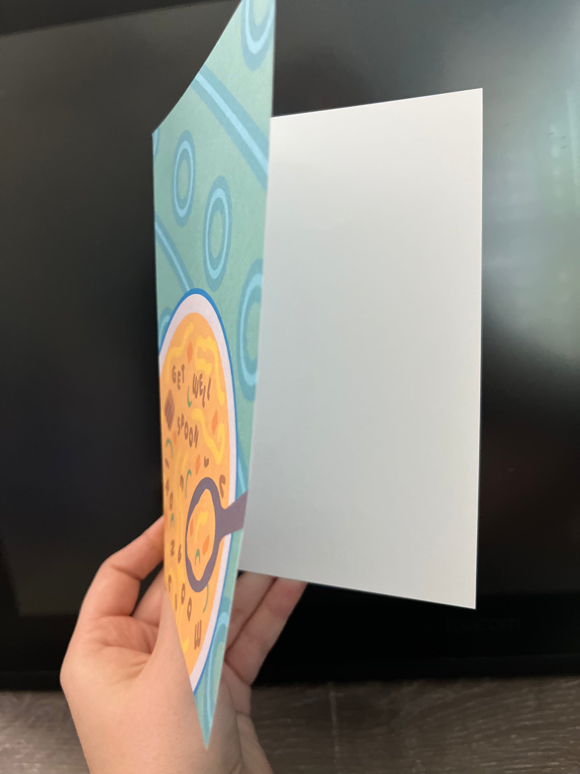 Friend feeling under the weather? This card is sure to make them smile with a pun. The perfect pairing for your Chicken Noodle Soup delivery. 5"x7" card includes envelope and protective sleeve to protect from water damage during delivery.