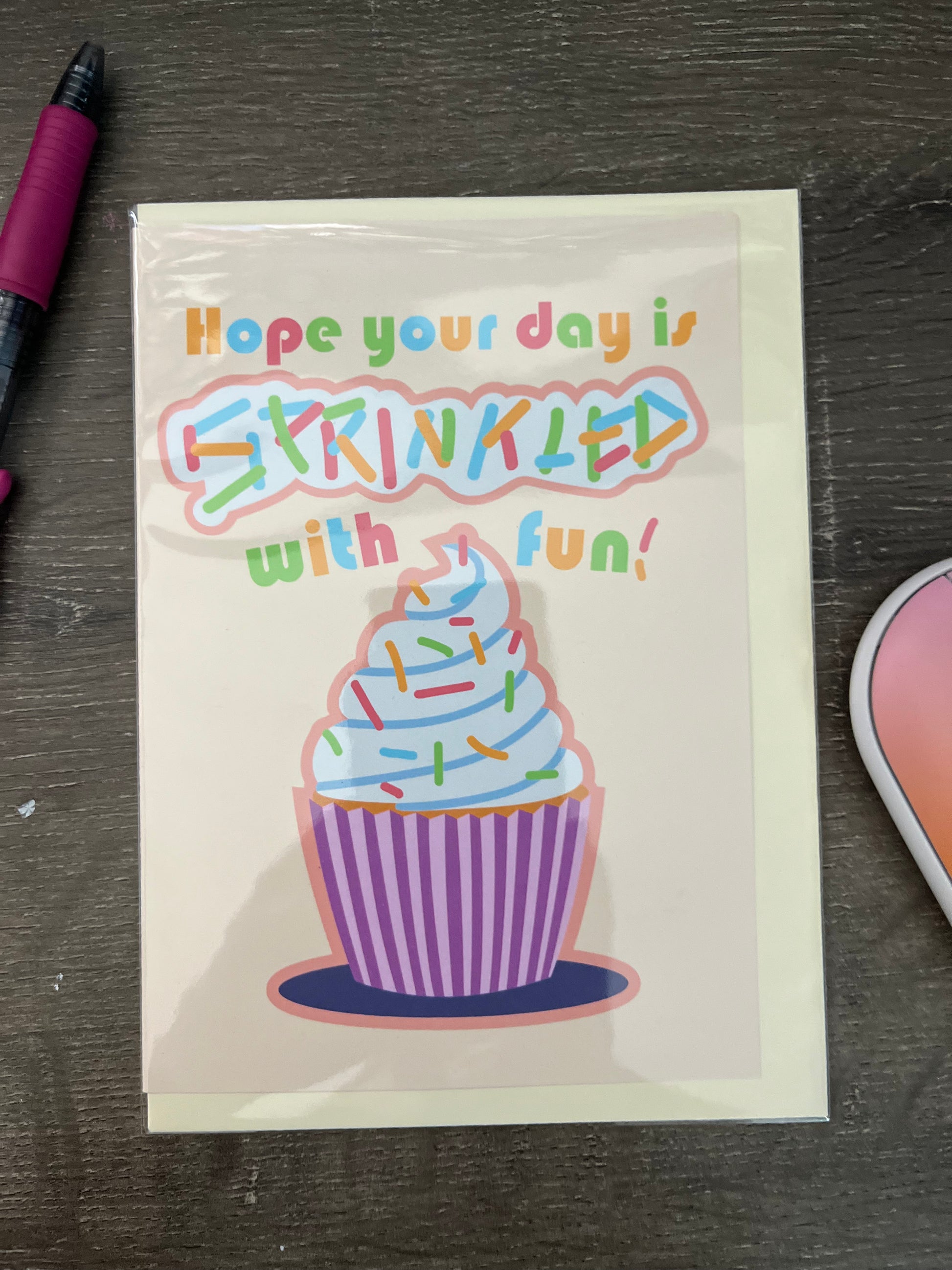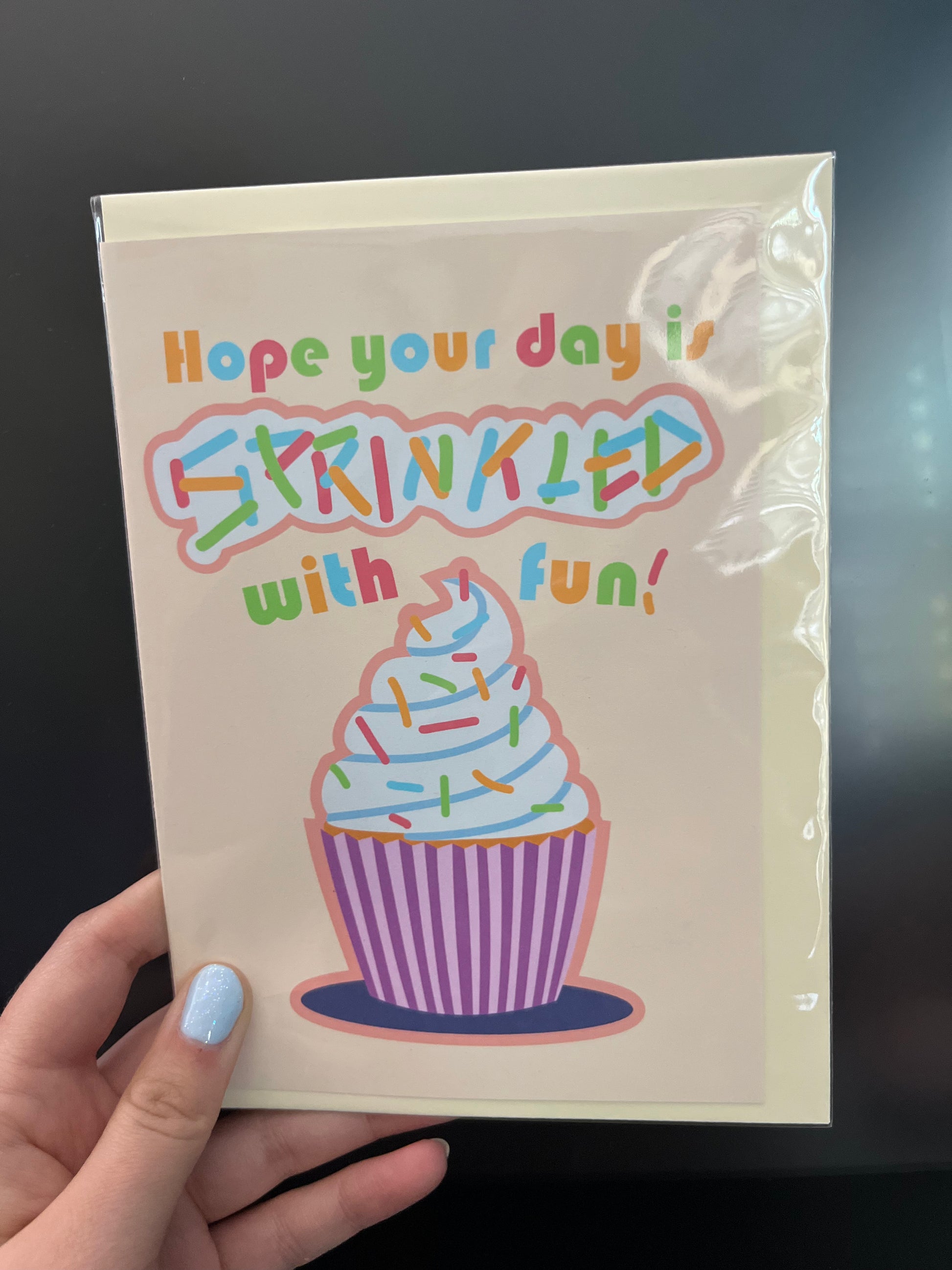 Adorable Happy Birthday card with a sprinkled cupcake. 5"x7" card includes envelope and protective sleeve to protect from water damage during delivery.